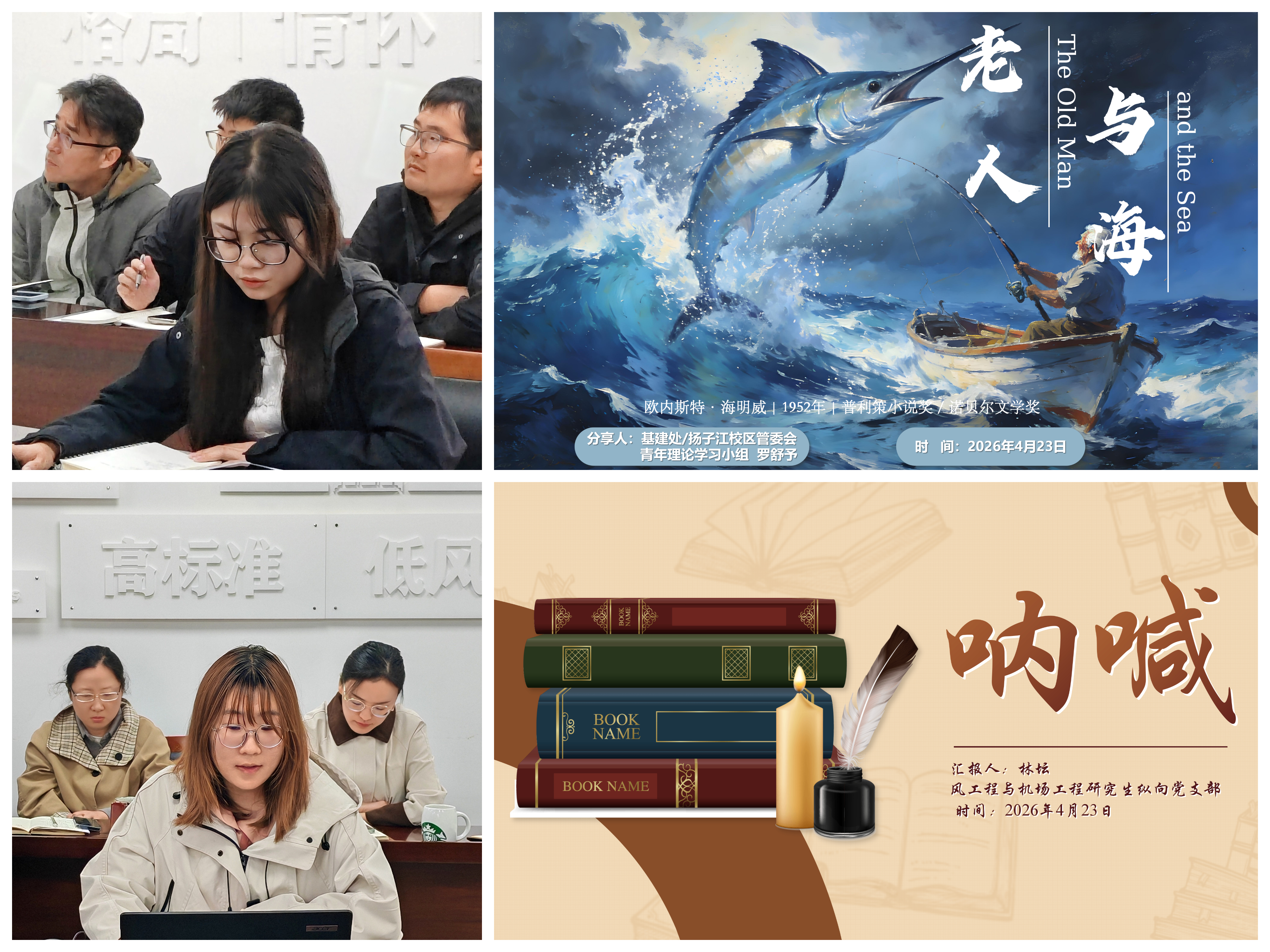 在读书分享环节,青年党员与学生代表结合经典著作畅谈感悟。基建处/扬子江校区管委会青年理论学习小组成员罗舒予以《老人与海》阐释坚韧不屈、实干担当的精神品格,立足基建岗位谈坚守、讲奉献;学生党员代表林坛围绕《呐喊》反思时代精神,倡导青年摒弃浮躁、勇担使命。分享既有思想深度,又贴近工作学习实际,引发全场强烈共鸣。