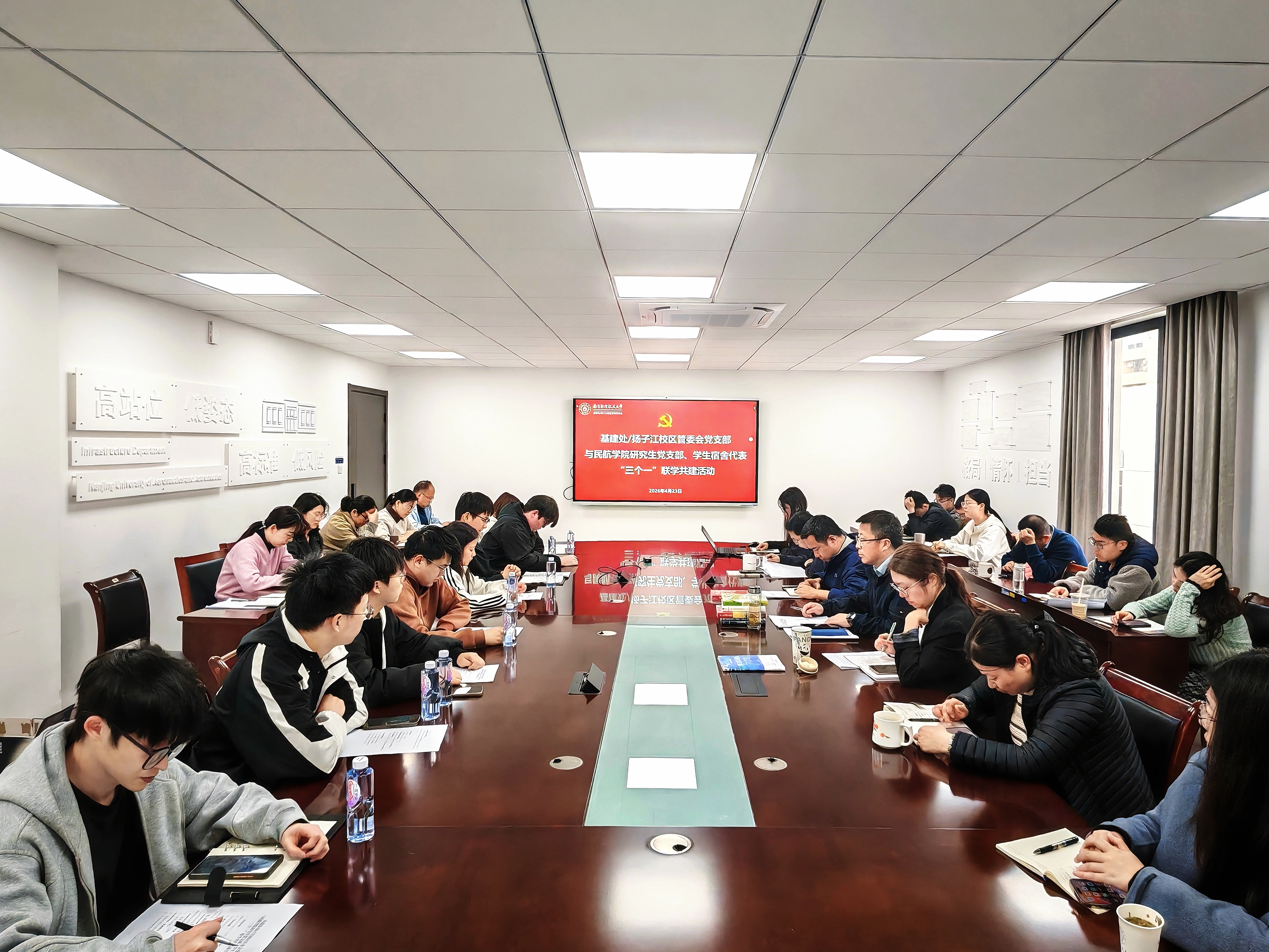 为深入学习贯彻习近平总书记关于树立和践行正确政绩观的重要论述,深化与学生支部联学共建实效,推动党建与育人、服务与发展深度融合,4月23日下午,基建处/扬子江校区管委会党支部联合民航学院风工程与机场工程研究生党支部、领导干部联系学生宿舍代表开展“三个一”联学共建主题活动。基建处/扬子江校区管委会党支部书记王炜主持活动。