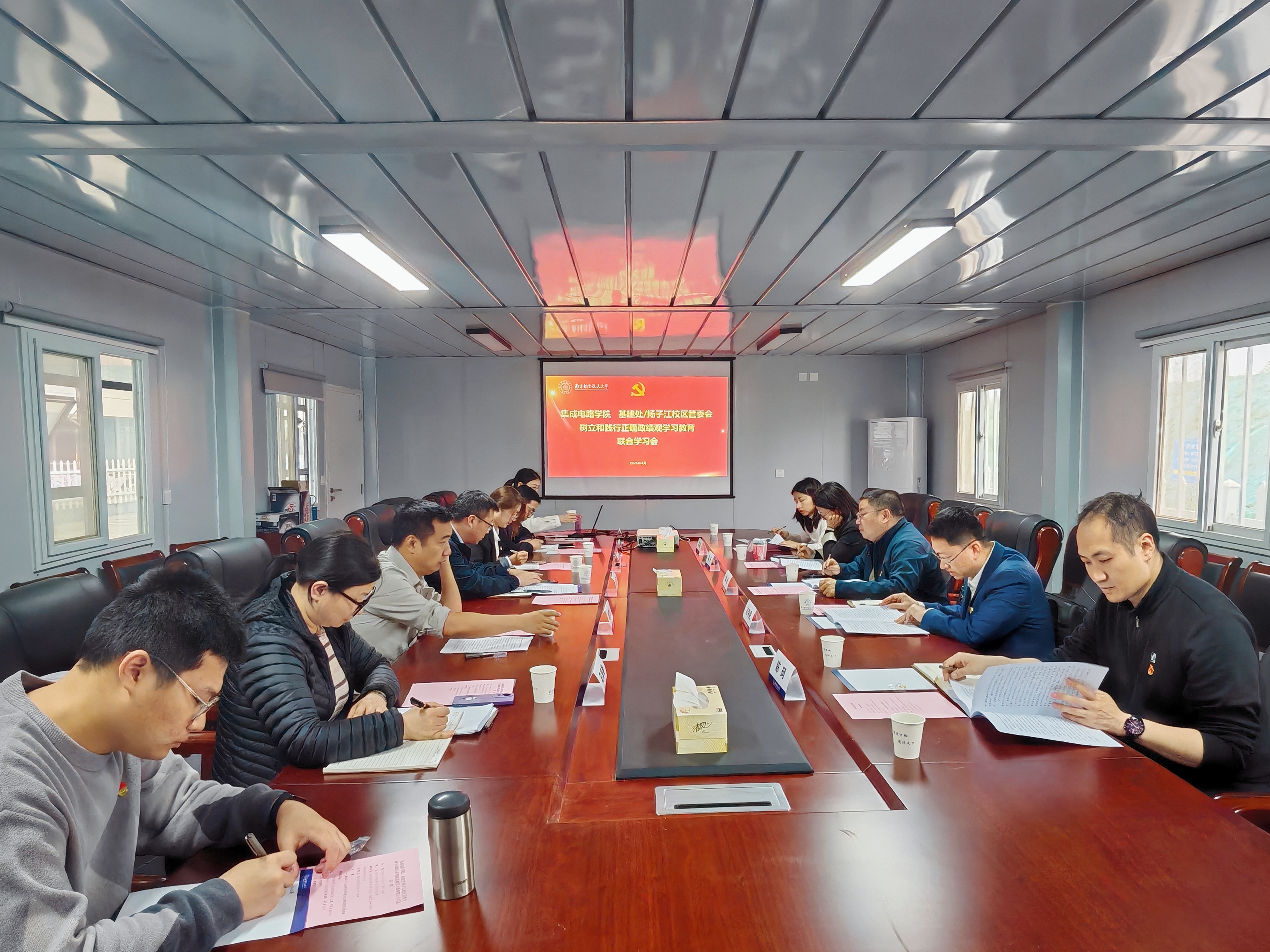 为深入开展树立和践行正确政绩观学习教育,推动学习成果转化为校区建设与学院发展的实际成效,4月23日,基建处/扬子江校区管委会党支部与集成电路学院党委在扬子江校区共同开展树立和践行正确政绩观学习教育联合学习会。会议由集成电路学院党委书记黄彬主持,集成电路学院执行院长、党委副书记刘伟强,基建处处长、扬子江校区管委会主任、党支部书记王炜,集成电路学院部分班子成员及相关工作负责人、基建处/扬子江校区管委会全体班子成员及相关科室负责人等参加活动。